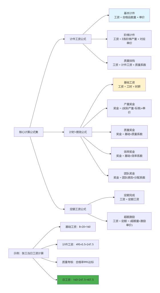 - 逻辑:按合格品数量计算薪酬(如公式:工资 = 合格品数量 × 计件单价)。